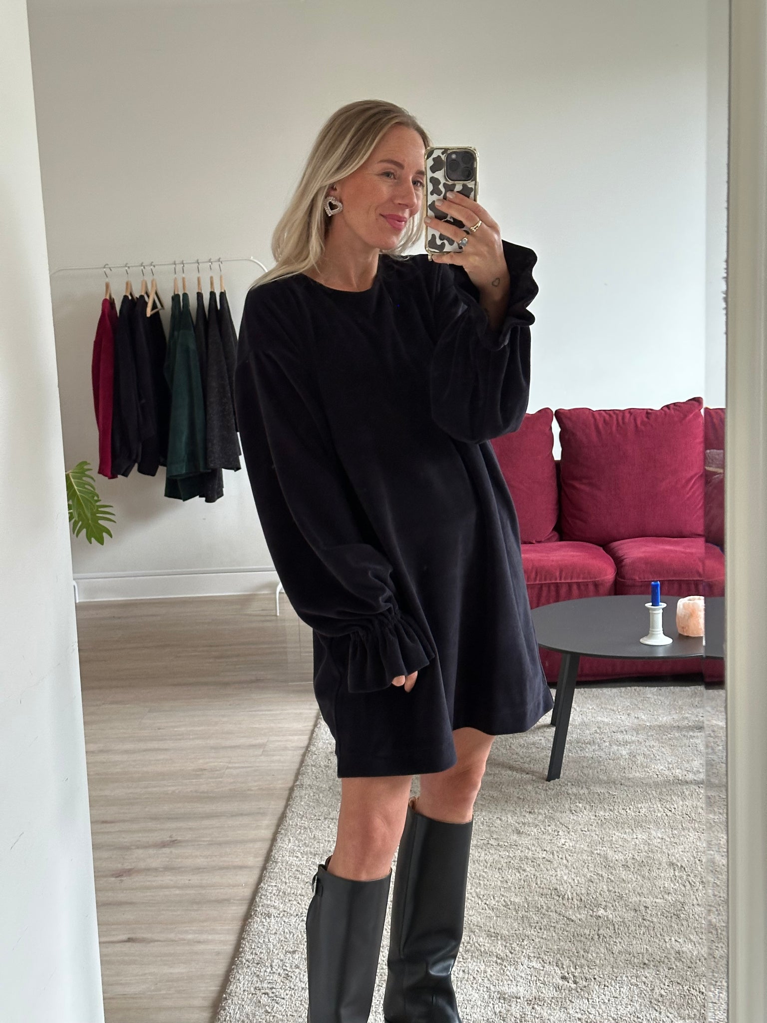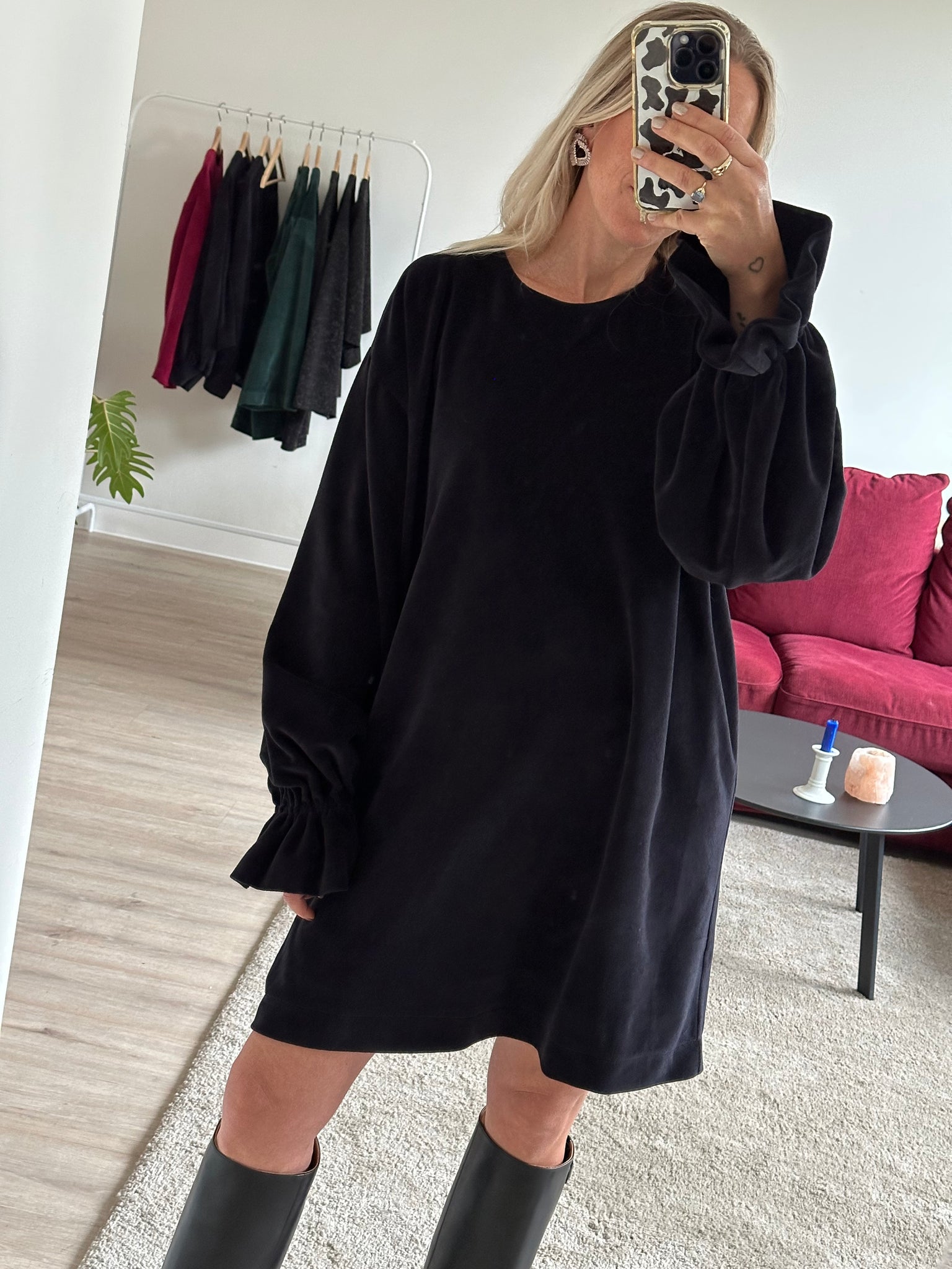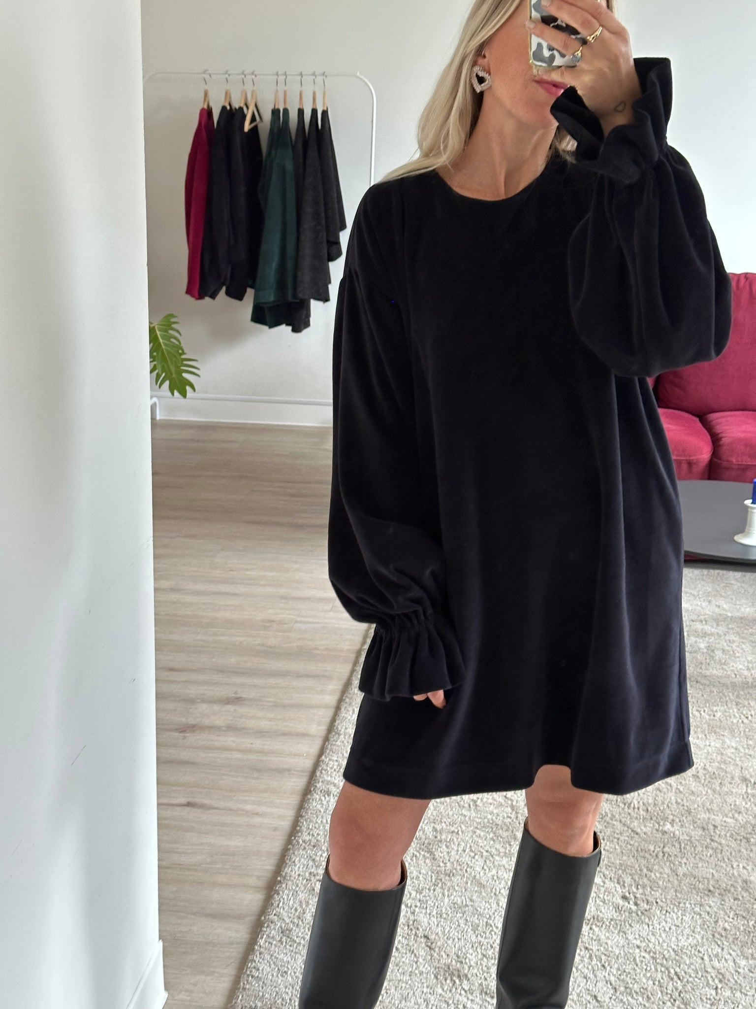 De Mae sweatdress is een lange sweater met gepofte mouwen met aan het uiteinde een doezel. Ze kan als lange sweater op een broek maar ook als jurk gedragen worden. Gemaakt van zacht velours, een heerlijke look voor de feestdagen.